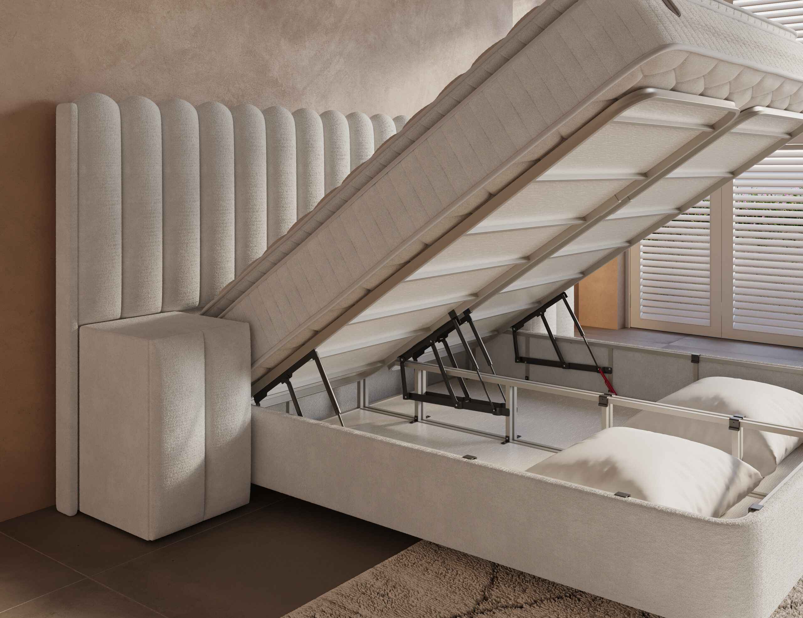 Geïntegreerd opbergsysteem met metalen frame en krachtige gasveren, eenvoudig te openen vanaf de voorkant.